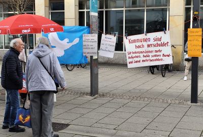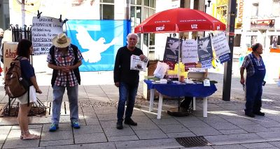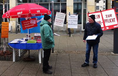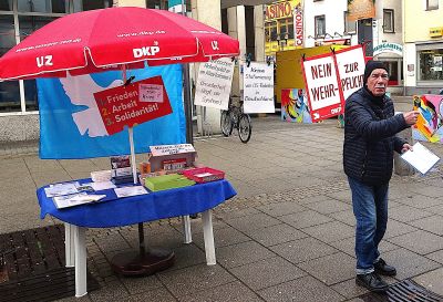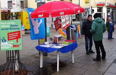 ![]() ![]() Wir waren diesmal nicht nur am Stand, sondern haben auch eine kleine, kurze Demo in der Karlstraße und der Hauptstraße gemacht. ![]() 19. Oktober 2024 Wir haben einige Unterschriften unter den "Berliner Appell" gesammelt und unsere Flyer verteilt. ![]() Berliner Appell - bitte unterschreibt diesen selbst auch Hans und Reinhard haben zusätzlich Unterschriften an Bundeskanzler O. Scholz gesammelt. Dafür gab es eine Postkarte von "Ohne Rüstung leben". 1. September 2024 Infostand in der Karlstraße ![]() ![]() 15. Juni 2024 ![]() ![]() Wir hatten in der Karlstraße einen Infostand zur bundesweiten "Aktion Mietenstopp" aufgebaut. Dies war eine Aktion des DMB. Wir haben deren Flyer mit einem Einleger verstärkt. Flugblatt 8. Juni 2024 Am Tag vor den Wahlen machten wir noch einmal Wahlwerbung. Wir verteilten an unserem Infotisch in der Karlstraße einen Flyer gegen die Erlaubnis jetzt auch Natowaffen von ukrainischem Gebiet gegen Russland einzusetzen. 4. Mai 2024 Veranstaltung der Friedensgruppe vor der Stadtbibliothek ![]() 1. Mai 2024 Am 1. Mai waren wir mit einem Infostand beim DGB am Lokschuppen. Wir haben 25 Blickpunkte und anderes Material verteilt. Leider waren es weniger Teilnehmer als die Jahre vorher. Für das UZ-Probeabo konnten wir einen Teilnehmer gewinnen. ![]() 13. April 2024 ![]() ![]() 30. März 2024 Am Ostersamstag fanden deutschlandweit viele Ostermärsche statt. Auch in Ellwangen und Ulm, an denen FreundeInnen und GenossenInnen der DKP HDH teilnahmen. Unser Foto entstand am Rande der Kundgebung in der Innenstadt beim Ulmer Ostermarsch. ![]() |