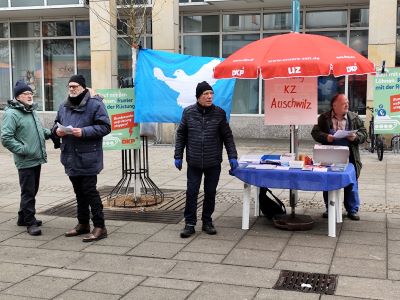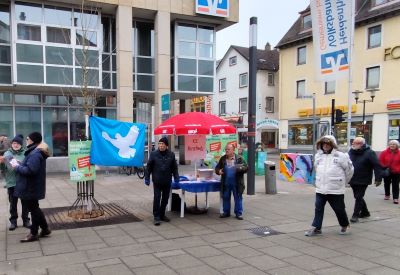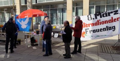 DKP HDH in Aktion 7. März 2026 Am 7. März hatten wir inmitten der Infostände anderer Parteien unseren Infostand zum Frauentag. Man merkte leider auch, dass Landtagswahlkampf war. Anstatt wie die vergangenen Jahre 300 Blumen zu verteilen hatten wir nur 200 Stück gekauft und diese in der gleichen Zeit verteilt wie sonst. Die Menschen waren durch die anderen Parteien anscheinend gesättigt. ![]() 7. Februar 2026 ![]() ![]() 24. Januar 2026 Kurz vor dem Jahrestag der Befreiung des KZ Auschwitz (27.01.) haben wir dazu einen Flyer gemacht. Da der Überfall Venezuelas durch die USA wegen Trump und Grönland in Vergessenheit gerät haben wir zusätzlich einen Soliflyer gemacht und verteilt. ![]() ![]() Flyer: 6. Dezember 2025 ![]() ![]() ![]() ![]() 15. November 2025 ![]() 20. September 2025 An unserem Infostand verteilten wir einen Flyer des "Netzwerk Friedenskooperative" mit dem Aufruf, an der Friedens-Demo am 3. Oktober in Stuttgart teilzunehmen. ![]() ![]() 14. Juni 2025 ![]() 10. Mai 2025 ![]() 19. April 2025 Dieses Jahr fanden und finden wieder viele Ostermärsche statt. Einige von uns waren in Ulm (siehe Foto) um mit den Ulmer Genossinnen und Genossen gemeinsame Sache zu machen. Andere waren wieder in Ellwangen um dort die Friedensgruppe zu unterstützen. ![]() 8. März 2025 ![]() ![]() 15. Februar 2025 Der Info-Stand wurde wegen "Faschingssturm" nicht genehmigt. Da die Friedensbewegung für den 15.2.2025 zum 2. bundesweiten Aktionstag ausgerufen hatte, waren wir in der Innenstadt, um ein Flugblatt zu verteilen und Unterschriften für den Berliner Appell zu sammeln. Trotz Kälte konnten wir, auch mit guten Gesprächen, 15 Unterschriften erreichen. Wir machten Pause im Café und danach warben wir weiter für den Berliner Appell. Nach gut einer ¾ Stunde hatten wir insgesamt 24 Unterschriften gesammelt. Auch haben Genossen vor einer Woche beim LichtmessMarkt in Herbrechtingen 47 Unterschriften zusammen bekommen. Alle Listen zusammengezählt haben wir jetzt genau 100 Unterschriften. Wir hören nicht auf, und sammeln weiter Unterschriften für den Berliner Appell. Ihr könnt Euch auch Listen herunter laden und in Eurem Umfeld sammeln. Zudem haben wir 20 Unterschriften gegen die Wiedereinführung der Wehrpflicht gesammelt. 25. Januar 2025 |